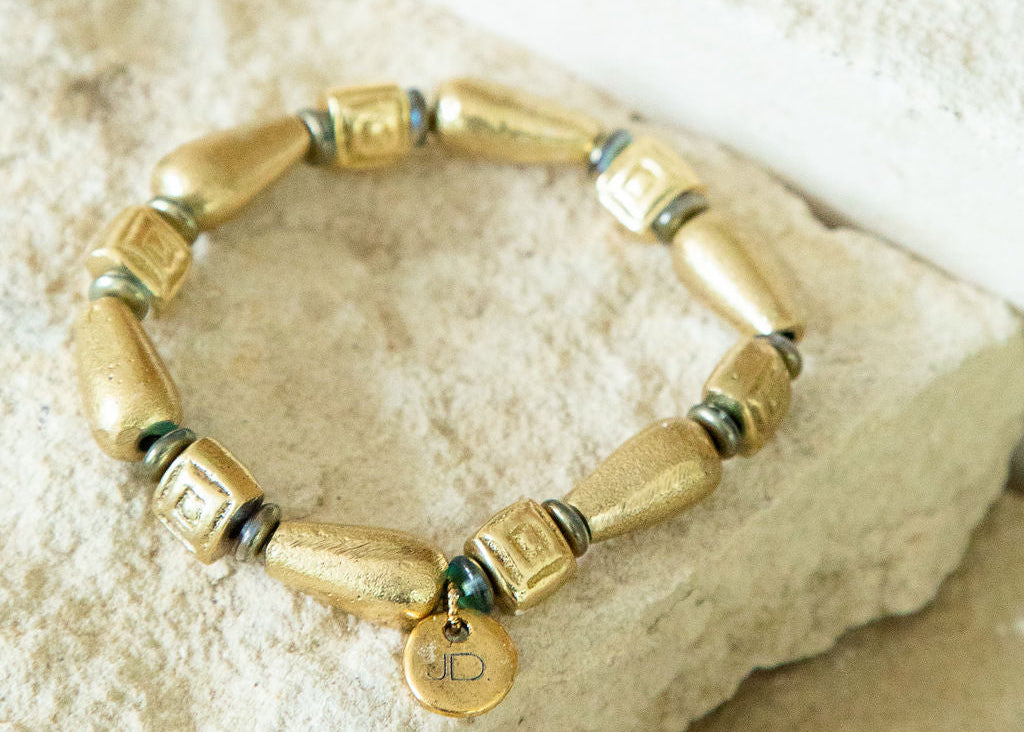 Cast brass forms the base of this adjustable ring, featuring a custom engraved monogram set beneath a smooth, glass-like resin coating. The clear, domed finish protects the engraving while giving the ring a polished, heirloom look.